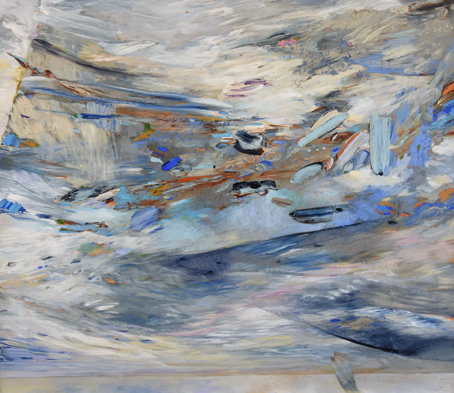 BLUE, WHITE, GRAY, RUST.  Acrylic on canvas, 42 x 48 inches, 2017.  (available)